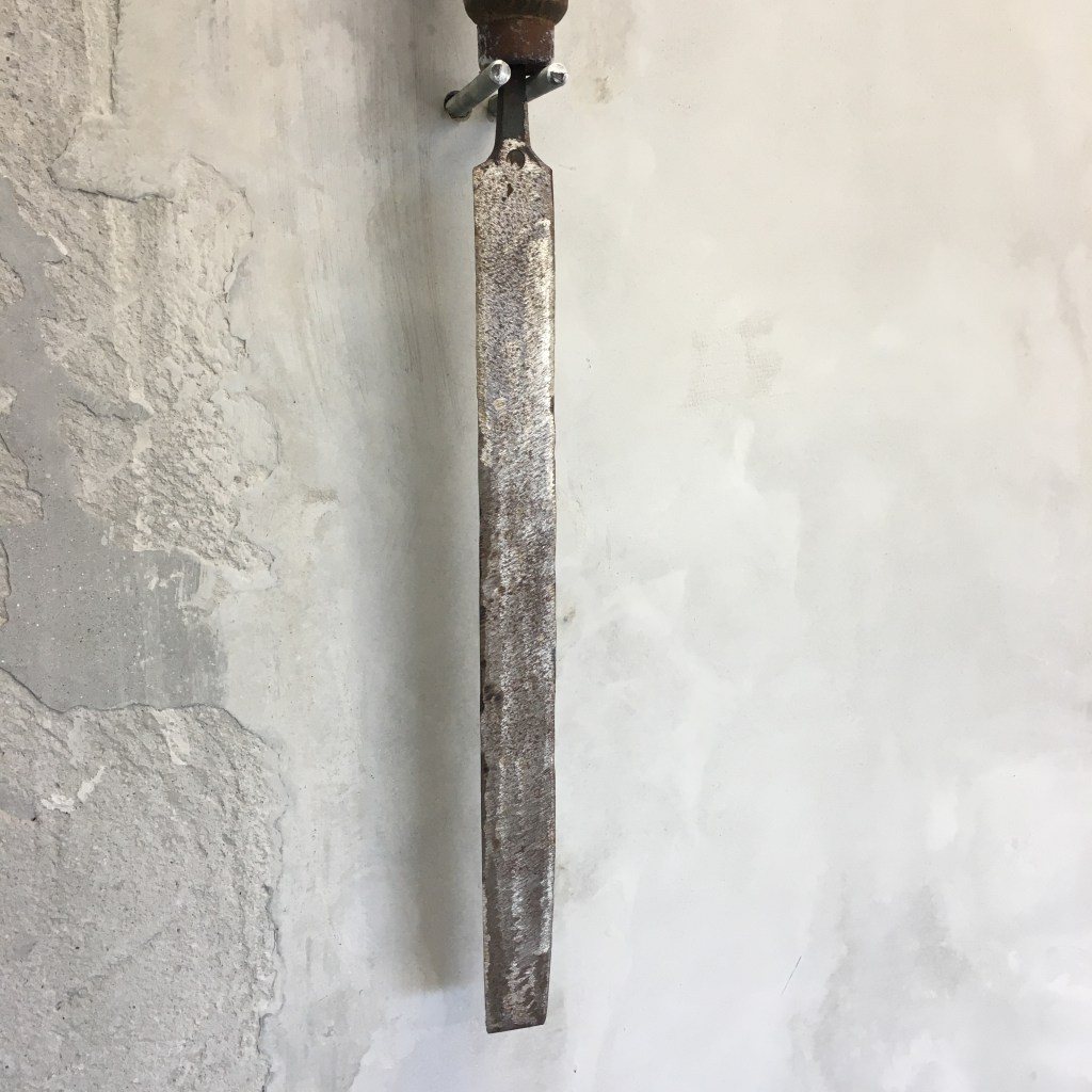 Daniella Pink‘s sculptures are almost choreographic in the way they extend the rhythms of the objects she chooses into the surrounding space. Working with homely objects that disclose by their surfaces the histories of their prior use, Daniella recombines the elements or her sculptures, building an evolving relationship with their constituent parts. Her Chaise, a simple wooden chair whose back legs have been augmented with the gentle curves of two rusted saw blades, is both supported and constrained by these additions. Having unseated its occupant in a lurch forward, its own human characteristics come to the fore, and Chaise remains poised in an attitude of continuous supplication.