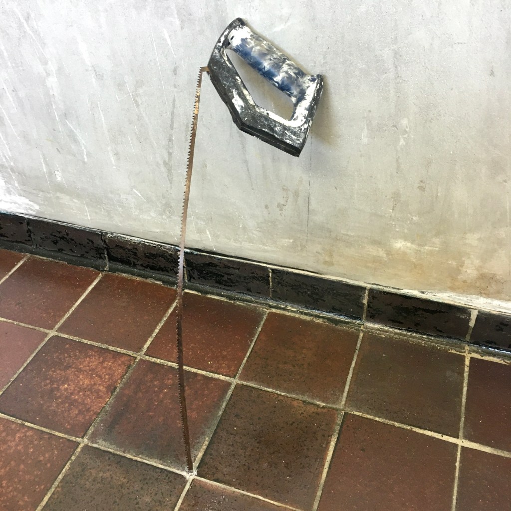 Ty Locke employs processes of absurd defamiliarization, enabling us to see objects anew. Preferring to work on exhibition installs in an improvisatory manner with materials gleaned from his surroundings, Ty has produced 2 new works on-site: a garden fork has been rendered perfectly useless by having its tines sectioned and fashioned into elegant tendrils; and in the portmanteau, Spork, another example of the same implement achieves a rapprochement with a spade, now seeming to shake hands with its toolshed rival. Ty also shows a number of works from his back catalogue, including the structurally compromised, Floppy Tennis Racket.