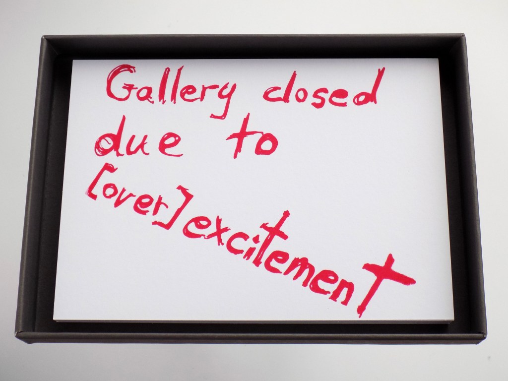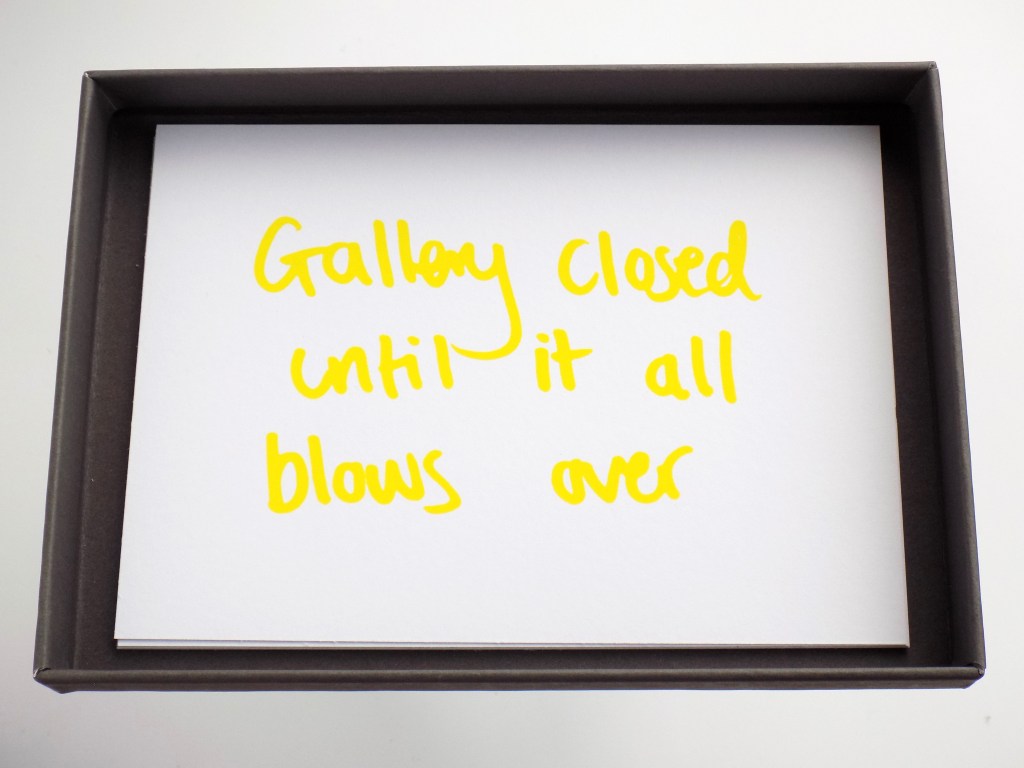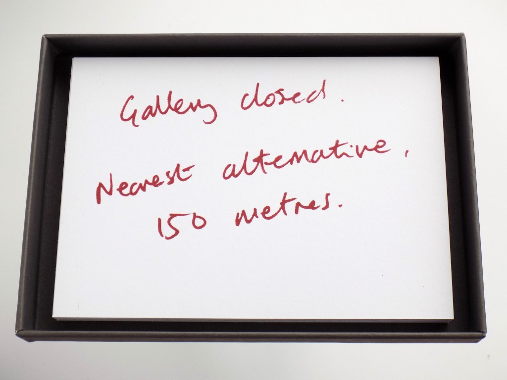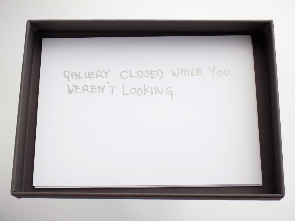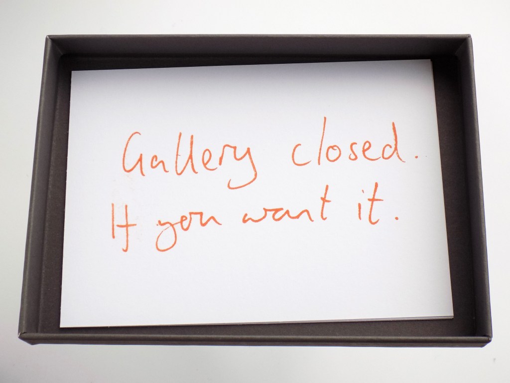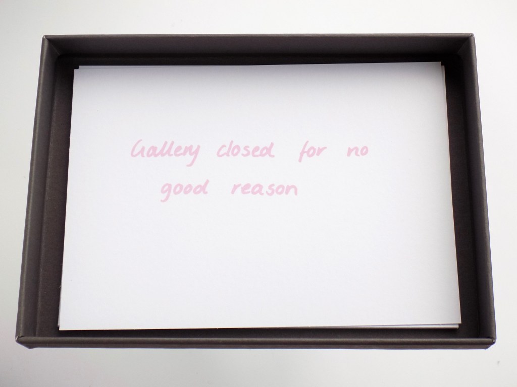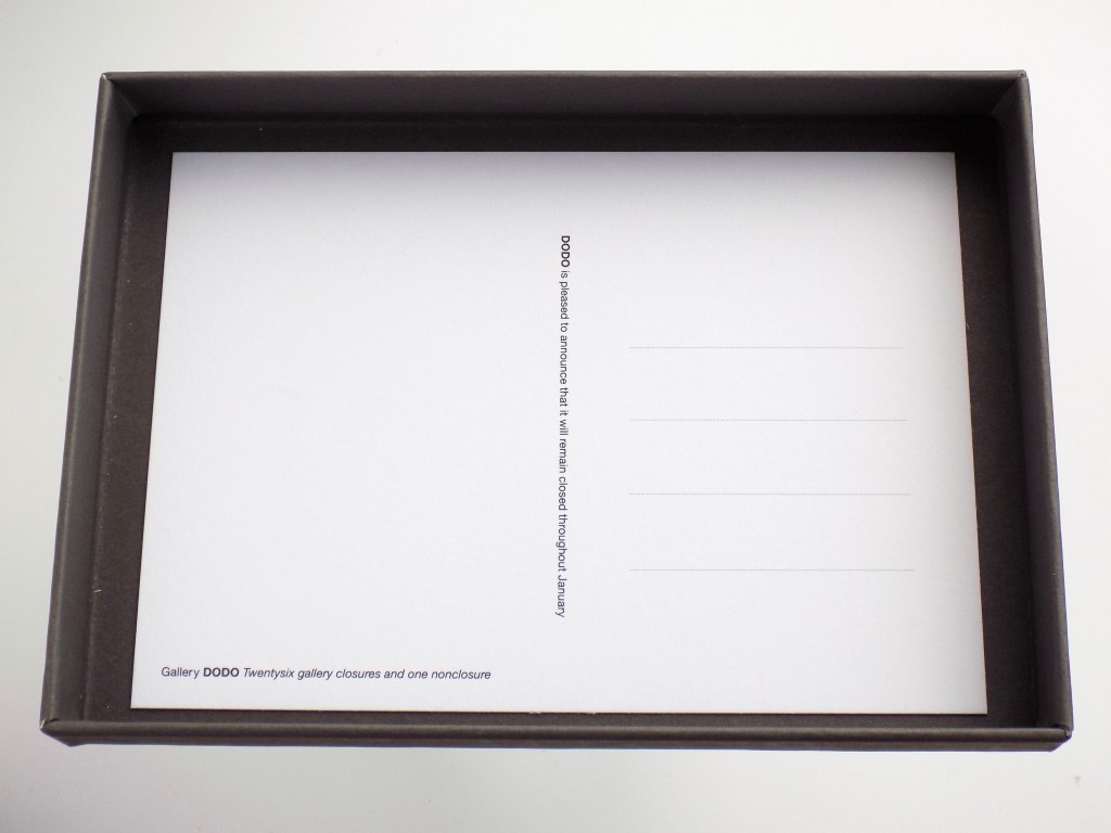 As a placeholder, and to commemorate this closure, Gallery DODO produced Twentysix gallery closures and one non-closure, a set of post-cards contained in a presentation box, each card screenprinted with a different gallery closure notice.