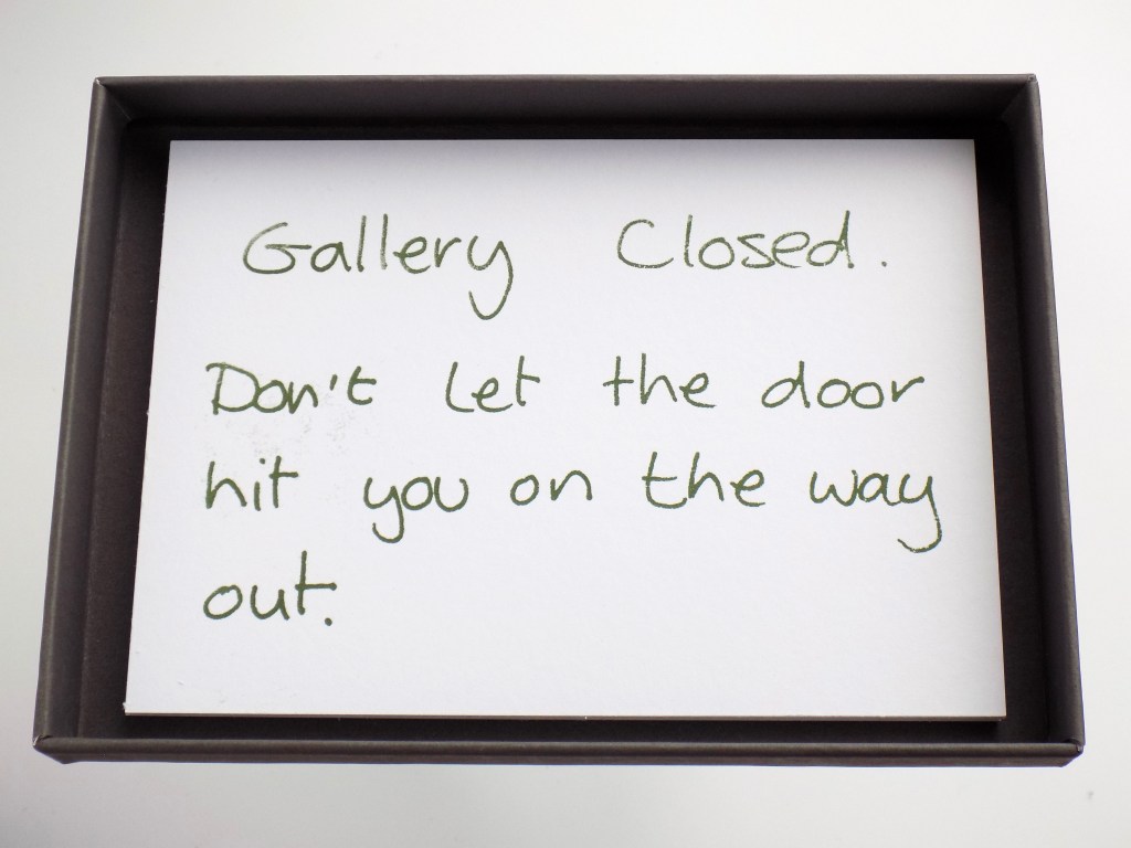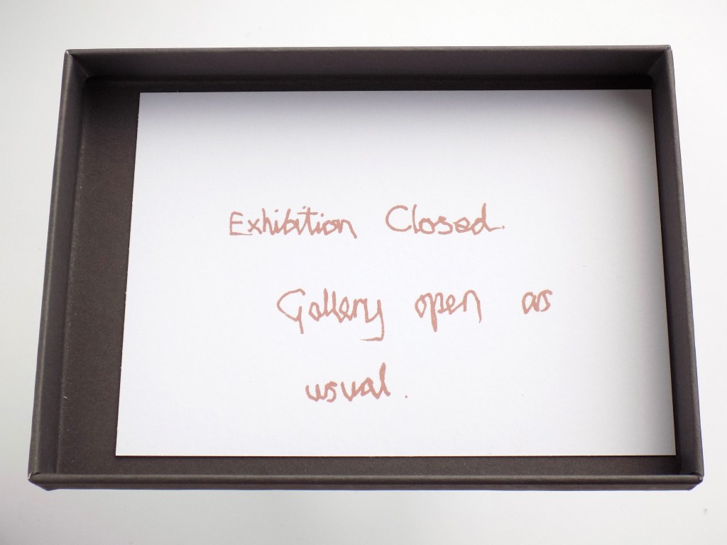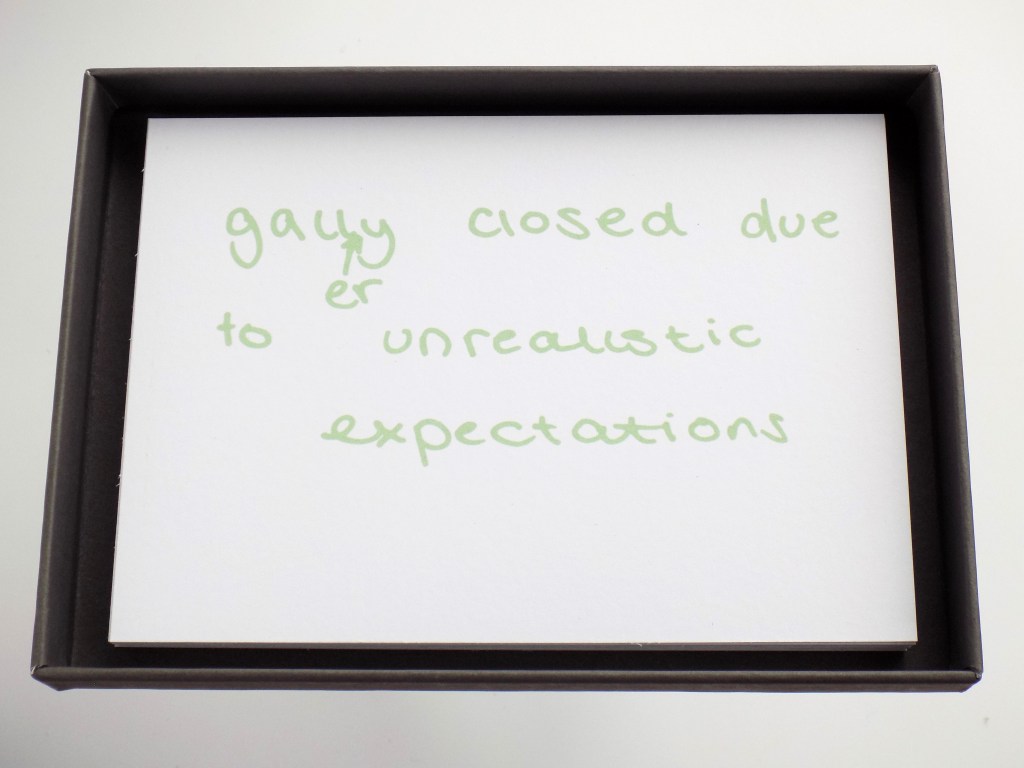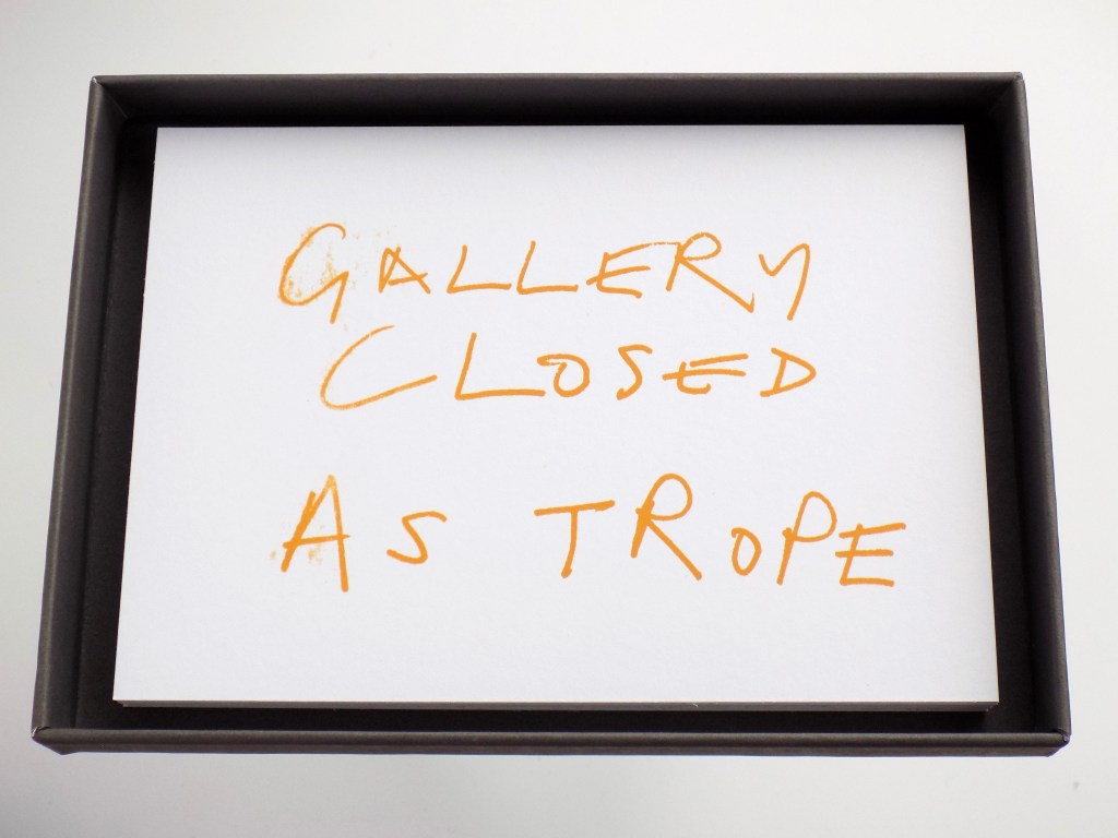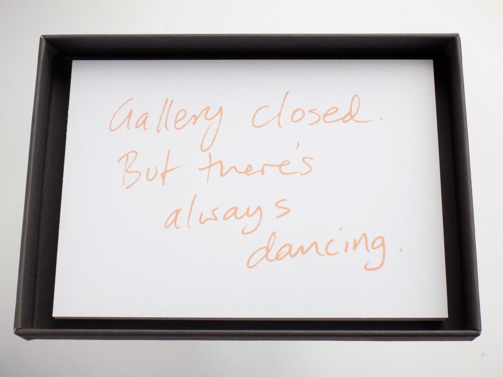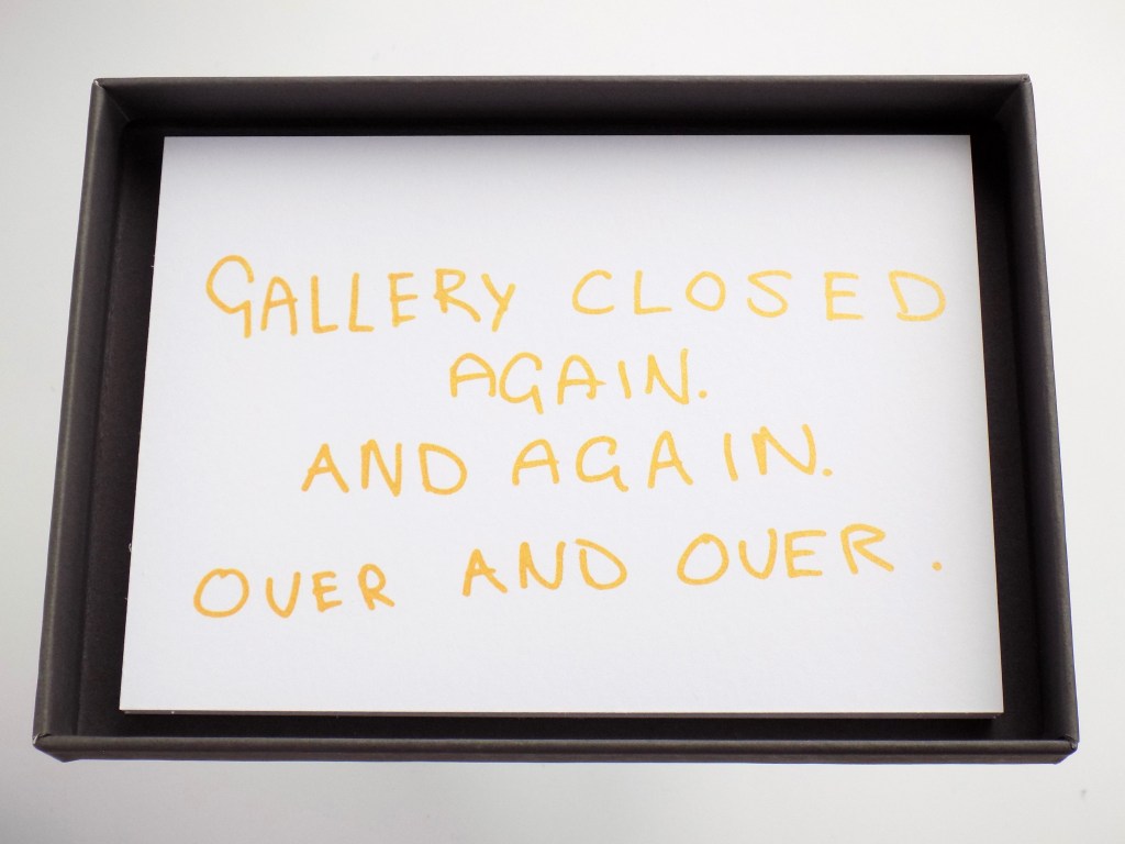 As a placeholder, and to commemorate this closure, Gallery DODO produced Twentysix gallery closures and one non-closure, a set of post-cards contained in a presentation box, each card screenprinted with a different gallery closure notice.