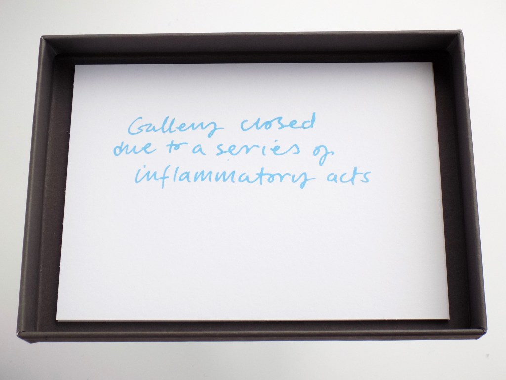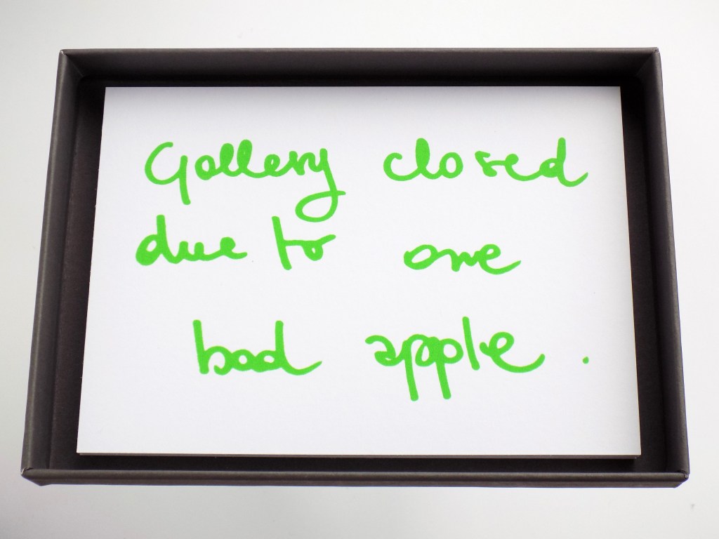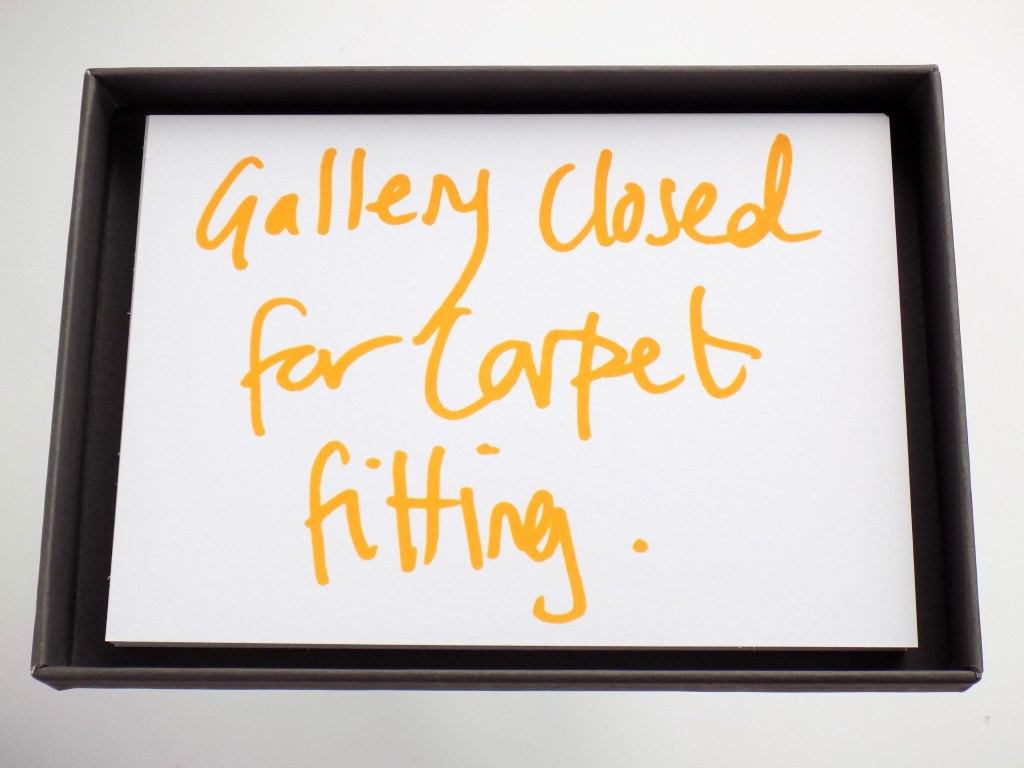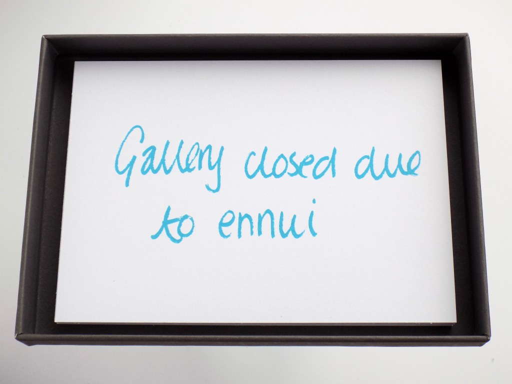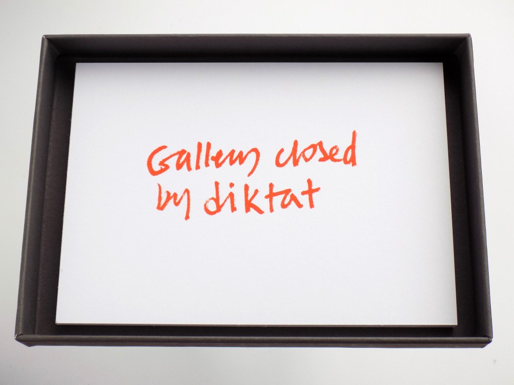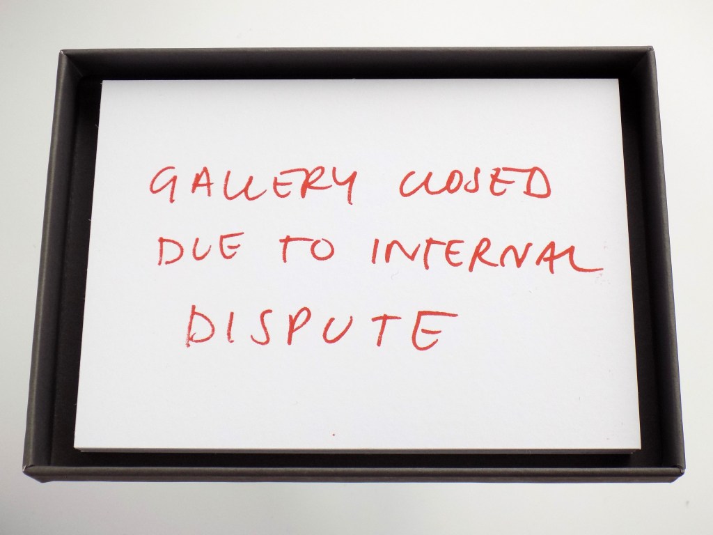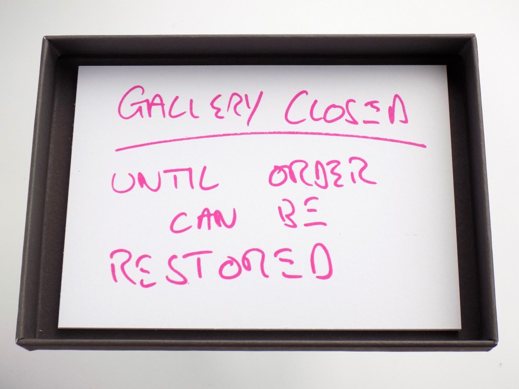 As a placeholder, and to commemorate this closure, Gallery DODO produced Twentysix gallery closures and one non-closure, a set of post-cards contained in a presentation box, each card screenprinted with a different gallery closure notice.