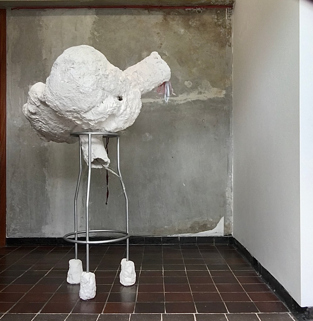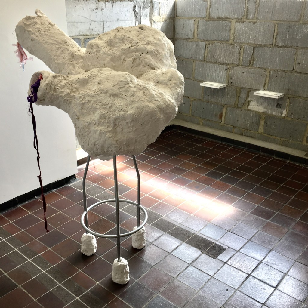 The central piece of the culminating exhibition consists of a large amorphously shaped plaster form, offering from the outside a number of orifices through which a seductive interior is glimpsed, but not fully apprehended. An all-encompassing interactive image of the interior, shot with a 360° camera, is made available by the artists offsite, however, on the exhibition’s Eventbrite listing and Gallery DODO’s Google Maps profile.
