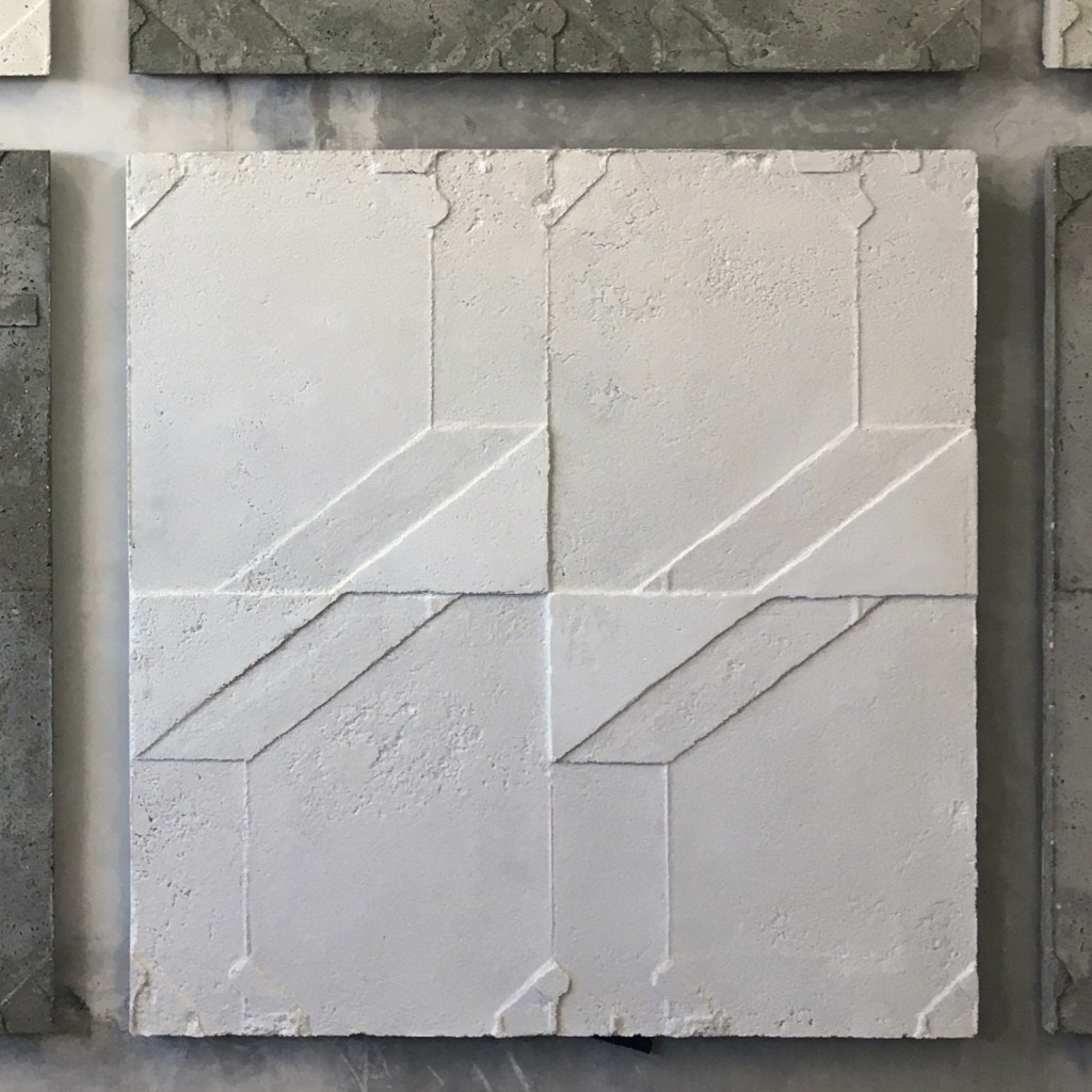 Hermione Allsopp is interested in objects as the carriers of collective memory and meaning. Working sometimes with ceramics and building materials, a number of the works she is showing respond to the material traces of the DODO space’s previous use as a washroom. Observing the vestiges of two removed cubicles in DODO’s tiled floor, the artist has reconfigured an earlier work, Synthetic Echo, in which a partition screen framed graphic suspended cutouts of institutional vinyl flooring. As installed, the partition has gone the same way as the original washroom cubicles, and a single tracery of flooring hangs from a screw driven into the wall.