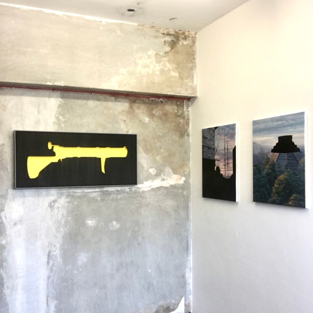Sid & Jim are fascinated by the suspension of disbelief required to enjoy narrative film and television unquestioningly. The Division of Perspective (Point of View Gun) is a custom foam insert in a discreet grey frame, shaped to accommodate the POV gun from The Hitchhiker’s Guide to the Galaxy. In the movie, the gun has the capability of changing the perspective of a targeted individual – from sceptic to believer, perhaps. However, outside the fictive construct of the film, the case must always be empty because the weapon has never had a substantive existence. The duo also show a pair of matte paintings conceived for unrealised films by Warner Herzog and David Lynch. Matte paintings are employed by filmmakers as backgrounds to composited live action. In Sid & Jim’s Standard Fantasy Setting series, however, the seamless illusionism of the image is disrupted by the surface presence of an irregular black shape, a blank space for the viewer’s own imaginative projections.