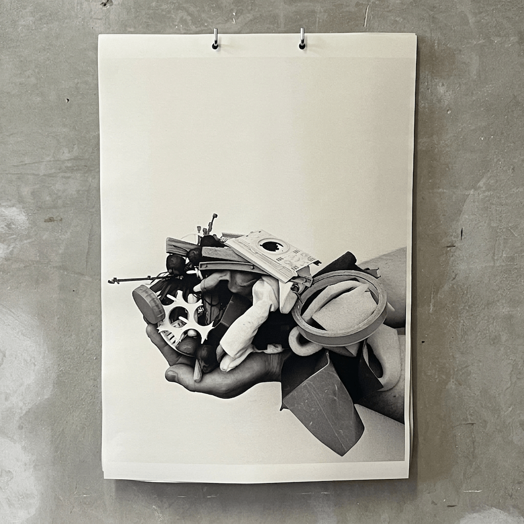 A seemingly random collection of everyday objects is also offered to us in a photograph from the series Pictures of Sculptures. An outstretched hand overflows with what appear to be discarded, possibly useless items, piled together in a precarious cluster—what Philip K Dick described as “kipple”, the gradual accumulation of trivial things. It remains unclear whether they form several small involuntary sculptures or a single larger one, momentarily balanced for the photograph to be taken. Here, the hand functions as a temporary support, a cornucopia of kipple that offers up debris as sculpture. Made as an endless edition, visitors are invited to take a copy.
