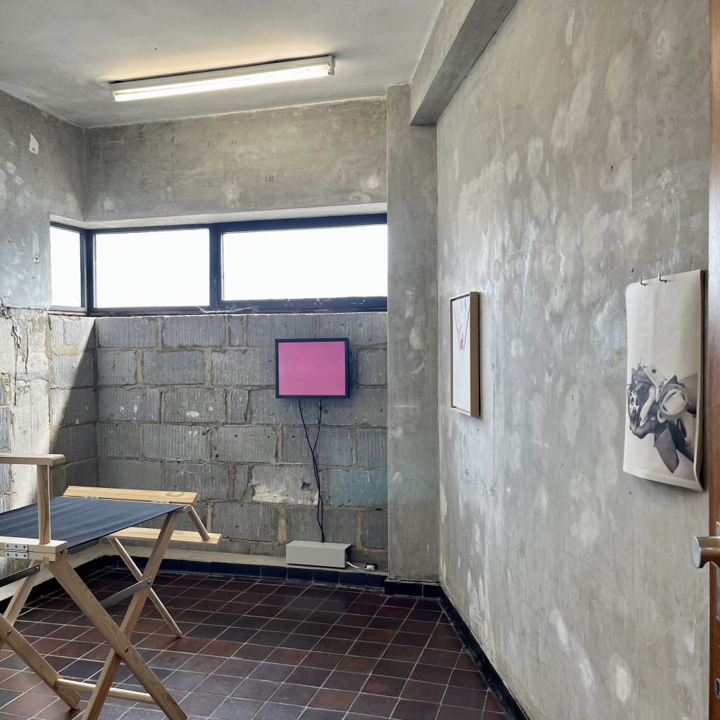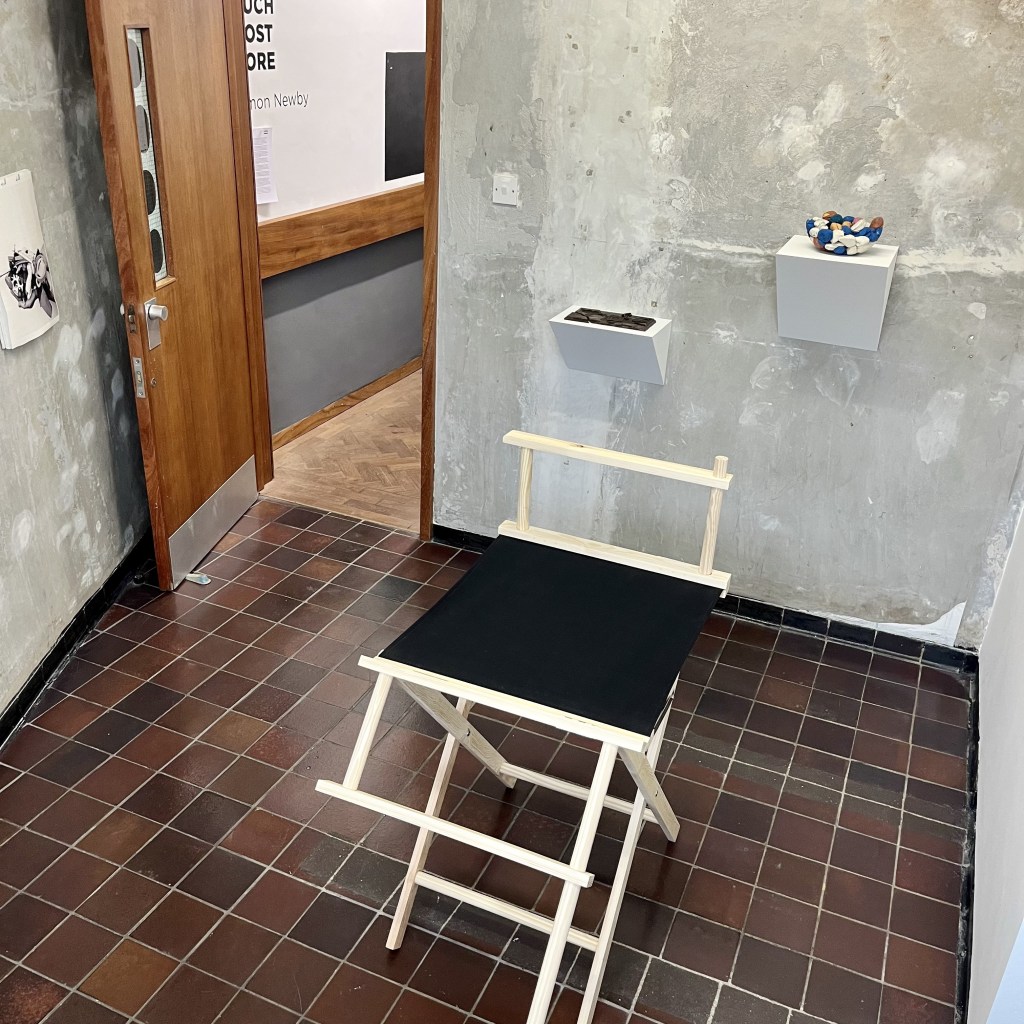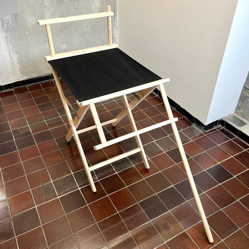 MMXXVI, with its ironically monumental Roman numeral title, adopts the portable design of the ‘scissor-action’ director’s chair (a form historically rooted in the ceremonial Roman curule seat). Though enlarged, partially dismantled, and reconfigured, the structure continues to support its black, colour-field canvas seat, held taut like a suspended plane of painting. The object’s architecture appears compromised, yet it remains stubbornly functional.