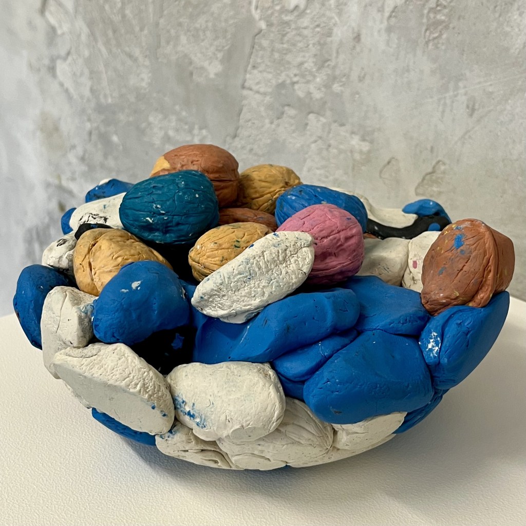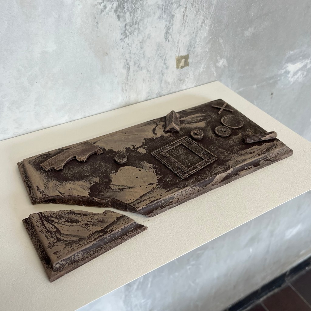 Cloak, plug, grip, night, chip, ride and Kipple make a classic culinary pairing of chocolate and nuts. Both works employ the technique of moulding. In one, modelling clay is shaped into the likeness of assorted nuts, their clustered arrangement suggesting they have settled into the curve of a bowl that forms the sculpture’s base. In the other, chocolate casts small miscellaneous objects arranged upon a plinth, itself made of chocolate. Each carries a distinct scent, extending the sculptural encounter beyond the visual.
