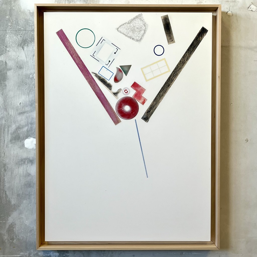 Red Apples Fall also plays a subtle game of surface and depth. Three-dimensional objects—wood, modelling clay, plastic—are formally composed and embedded within an acrylic composite. The slab is then polished to a smooth surface in which the objects appear as flattened shapes, creating a confusion between object and image. Depth is not eliminated but concealed, fossilised beneath the surface.